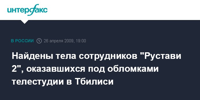 Тбилиси. 26 апреля. INTERFAX.RU - Спасатели извлекли из-под обломков обрушившегося в Тбилиси 4-этажного здания тела двоих погибших сотрудников телекомпании "Рустави 2", передает корреспондент "Интерфакса".