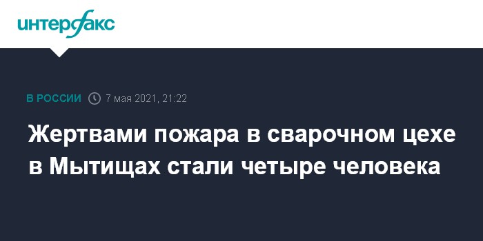 Москва. 7 мая. INTERFAX.RU - Четыре человека погибли в результате пожара в сварочном цехе в подмосковных Мытищах, сообщили "Интерфаксу" в пресс-службе главка МЧС Московской области.