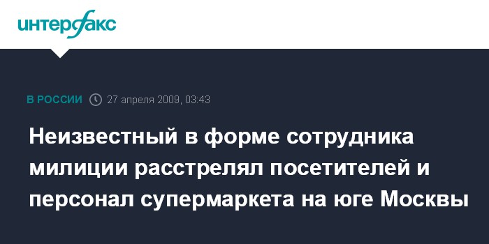 Москва. 27 апреля. INTERFAX.RU - В Москве в южном административном округе на улице Шипиловская неизвестный мужчина в форме майора милиции расстрелял из пистолета персонал и посетителей супермаркета "Остров".