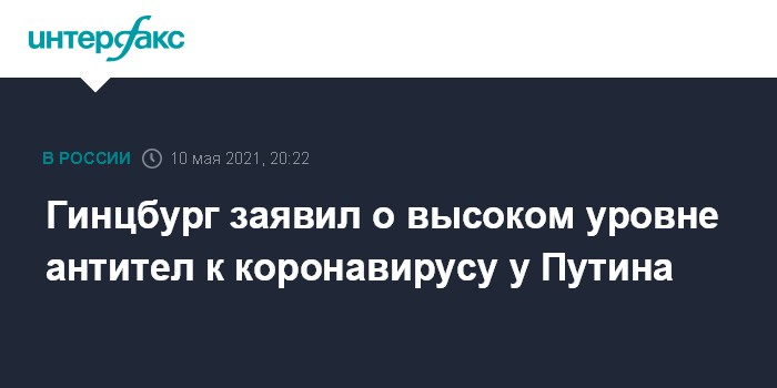 Москва. 10 мая. INTERFAX.RU - Президент РФ Владимир Путин, судя по озвученным им результатам тестирования, имеет после вакцинации очень высокий уровень защиты от коронавируса COVID-19, заявил в понедельник "Интерфаксу" гендиректор центра имени Гамалеи Минздрава России Александр Гинцбург.