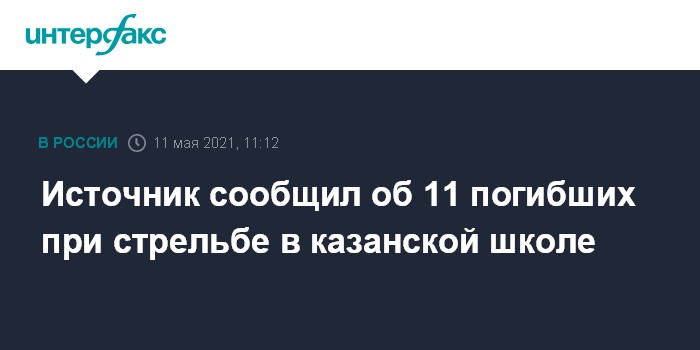 Москва. 11 мая. INTERFAX.RU - Жертвами стрельбы в казанской школе стали 11 человек, сообщил "Интерфаксу" информированный источник.