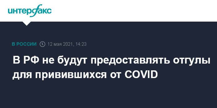 Москва. 12 мая. INTERFAX.RU - Решение о предоставлении отгулов для работающих после прививки от коронавируса на федеральном уровне не принималось, и в планах такого нет, сообщил журналистам пресс-секретарь президента РФ Дмитрий Песков.