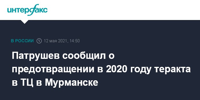 Москва. 12 мая. INTERFAX.RU - Спецслужбы и правоохранительные органы в 2020 году предотвратили теракт, который планировалось совершить в торговом центре в Мурманске, сообщил секретарь Совета безопасности России Николай Патрушев.