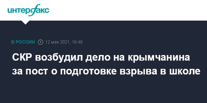 Москва. 12 мая. INTERFAX.RU - Крымчанин, который 11 мая в соцсети предупредил о подготовке нападения на школу ради проверки работы админов и спецслужб, стал фигурантом уголовного дела о ложном сообщении о теракте на социальном объекте (ч. 2 ст. 207 УК), сообщили в СК Крыма. Дело возбудили по материалам МВД и ФСБ.
