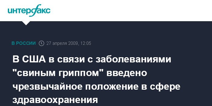 Москва. 27 апреля. INTERFAX.RU - Власти США ввели режим чрезвычайного положения в сфере здравоохранения после того, как было подтверждено заражение 20 человек вирусом H1N1, известным также как "свиной грипп". В настоящее время подтверждены восемь случаев заражения "свиным гриппом" среди нью-йоркских студентов, еще семь - в Калифорнии, по два - в Техасе и Канзасе и один - в Огайо.