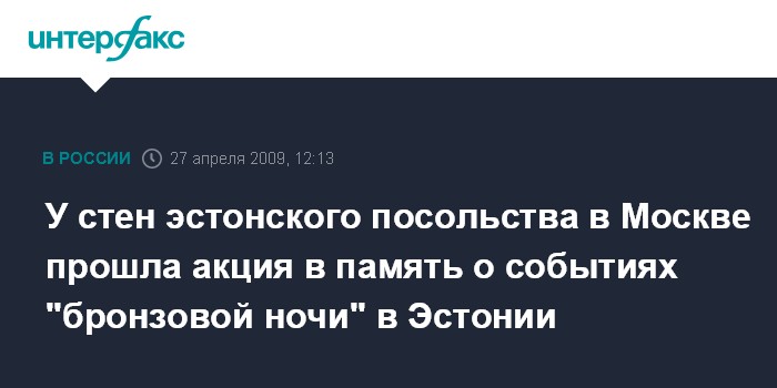 Москва. 27 апреля. INTERFAX.RU - Активисты молодежных движений "Наши" и "Россия молодая" провели в понедельник около стен посольства Эстонии в Москве акцию в память о событиях "бронзовой ночи" в Эстонии, которые произошли два года назад.