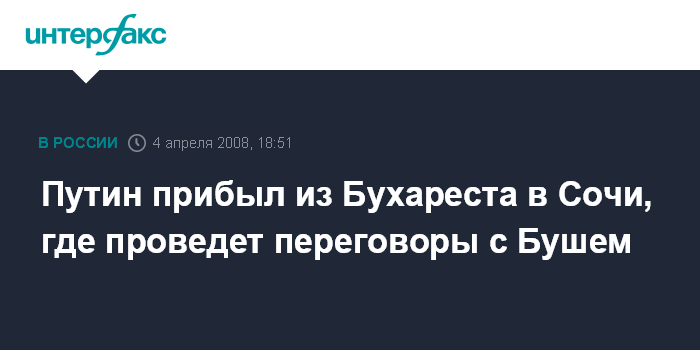 Сочи. 4 апреля. INTERFAX.RU - Президент РФ Владимир Путин по завершении совета Россия-НАТО прибыл из Бухареста в Сочи, где в субботу состоится его неформальная встреча с президентом США Джорджем Бушем, сообщил пресс-секретарь президента РФ Алексей Громов. На воскресенье запланированы официальные переговоры лидеров двух стран.