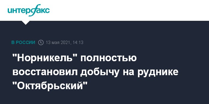 Москва. 13 мая. INTERFAX.RU - "Норильский никель" 7 мая полностью восстановил добычу руды на руднике "Октябрьский", нарушенную после аварии в конце февраля, сообщила компания.