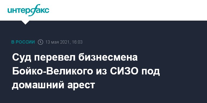 Москва. 13 мая. INTERFAX.RU - Мосгорсуд изменил меру пресечения с содержания под стражей на домашний арест бизнесмену Василию Бойко-Великому, обвиняемому в особо крупных хищениях, сообщил "Интерфаксу" его адвокат Игорь Зубер.