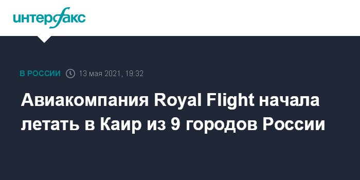Москва. 13 мая. INTERFAX.RU - Авиакомпания Royal Flight начала выполнять регулярные рейсы в Каир из девяти городов России, первый рейс отправился из Екатеринбурга с полной загрузкой, сообщили порталу "Интерфакс-Туризм" в пресс-службе перевозчика.