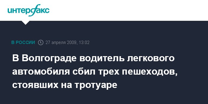 Москва. 27 апреля. INTERFAX.RU - В Ворошиловском районе Волгограда легковой автомобиль, выехав на тротуар, сбил трех человек, все пострадавшие были госпитализированы с травмами.