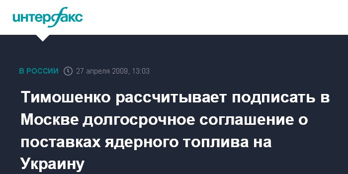 Москва. 27 апреля. INTERFAX.RU - Премьер-министр Украины Юлия Тимошенко намерена в ходе своего визита в Москву 29 апреля подписать с российской стороной долгосрочное соглашение по поставкам ядерного топлива.