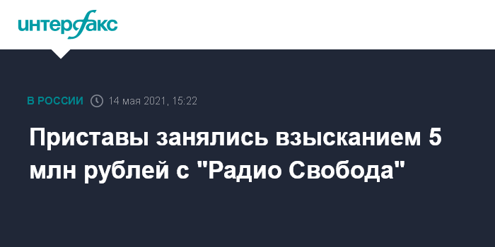 Москва. 14 мая. INTERFAX.RU - Судебные приставы уведомили московское бюро медиакорпорации "Радио Свободная Европа/Радио Свобода" (РСЕ/РС, признано властями России СМИ-иноагентом) о том, что намерены взыскать 5 млн рублей по десяти штрафам, назначенным за отсутствие маркировки "иноагент" в материалах.