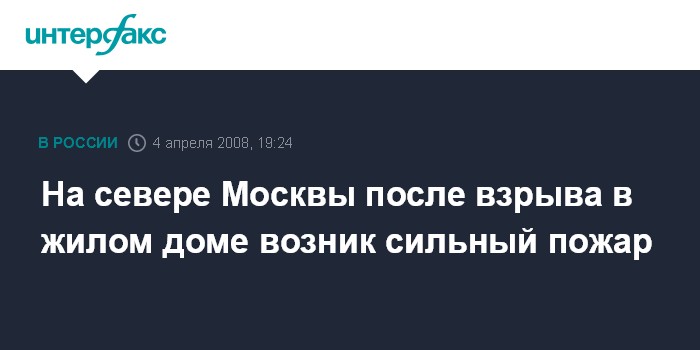 Москва. 4 апреля. ИНТЕРФАКС-МОСКВА - В Москве в Северо-Восточном административном округе после взрыва в 20-этажном жилом доме возник сильный пожар.