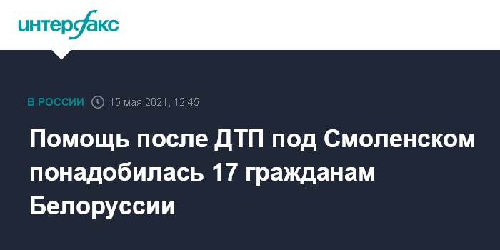 Москва. 15 мая. INTERFAX.RU - Медицинская помощь после аварии с участием микроавтобуса в Смоленской области понадобилась 17 гражданам Белоруссии, сообщает в субботу пресс-служба администрации области.