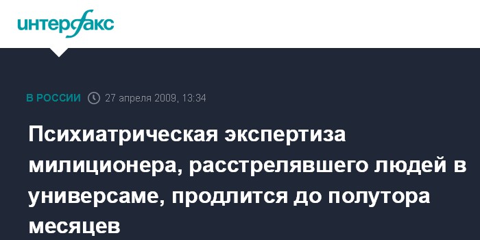 Москва. 27 апреля. INTERFAX.RU - Психиатрическая экспертиза милиционера, расстрелявшего людей в супермаркете на юге Москвы, продлится до полутора месяцев, после чего материалы будут переданы в суд, сообщил в понедельник "Интерфаксу" высокопоставленный источник в медицинских кругах столицы. По его словам, в таких случаях экспертиза может затянуться до полутора месяцев. "В таких случаях не стоит торопиться. В среднем такие экспертизы занимают месяц-полтора", - добавил собеседник "Интерфакса". Он подчеркнул, что будет создана комиссия из специалистов, которые дадут независимую оценку.