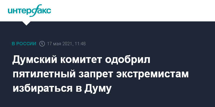 Москва. 17 мая. INTERFAX.RU - Комитет Госдумы по контролю и регламенту нашел обоснованным запрет на срок до пяти лет избираться в Думу тем, кто участвовал в работе организаций, признанных в России экстремистскими.