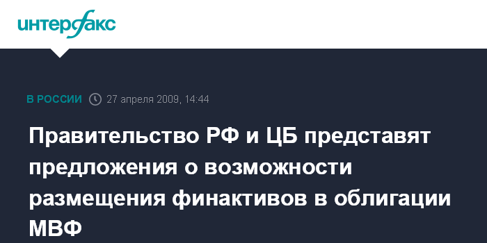 Москва. 27 апреля. INTERFAX.RU - Президент РФ Дмитрий Медведев дал поручение правительству и Центробанку представить предложения о возможности размещения финансовых активов РФ в облигации МВФ, сообщает пресс-служба Кремля.