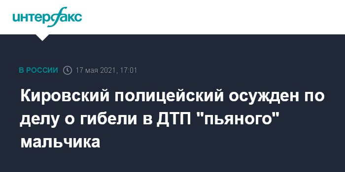 Москва. 17 мая. INTERFAX.RU - Уржумский районный суд Кировской области вынес приговор бывшему сотруднику полиции по делу о гибели в ДТП шестилетнего мальчика, у которого затем обнаружили в крови алкоголь.