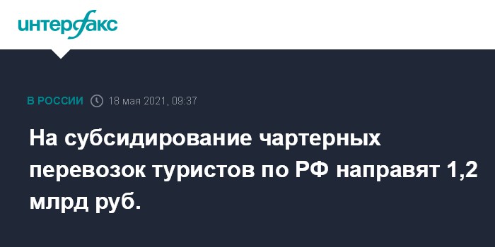 Москва. 18 мая. INTERFAX.RU - Правительство России выделит 1,2 млрд рублей на субсидирование чартерных туристических перевозок по РФ в качестве меры поддержки туристической отрасли.