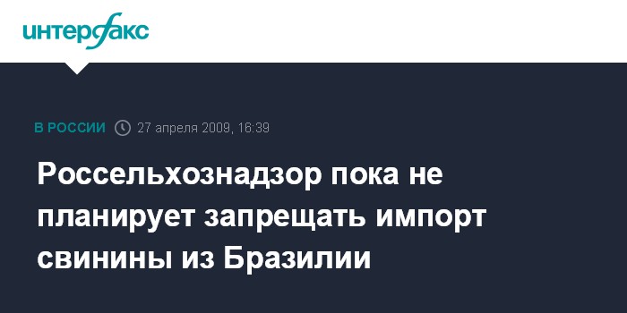 Москва. 27 апреля. INTERFAX.RU - Россельхознадзор пока не планирует запрещать импорт свинины из Бразилии, заявил главный государственный ветинспектор РФ, заместитель руководителя Россельхознадзора Николай Власов.