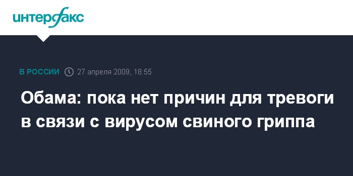 Вашингтон. 27 апреля. INTERFAX.RU - В настоящее время нет причин для тревоги в связи с распространением вируса свиного гриппа в США, заявил в понедельник президент этой страны Барак Обама во время своего выступления в Национальной академии наук.