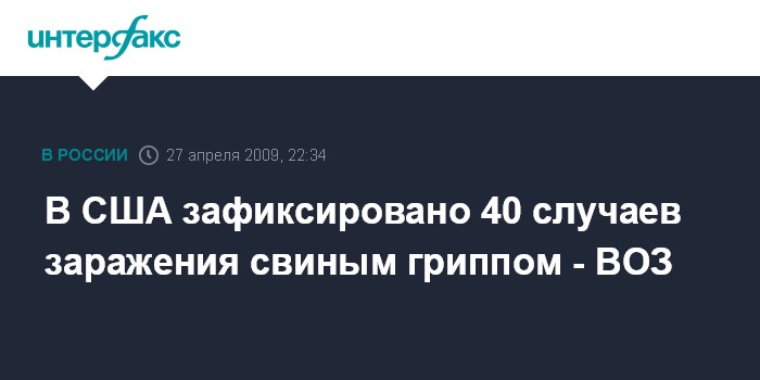 Женева. 27 апреля. ИНТЕРФАКС - Всемирная организация здравоохранения (ВОЗ) сообщила о 40 случаях заражения свиным гриппом в США, передает в понедельник агентство ЭФЭ.