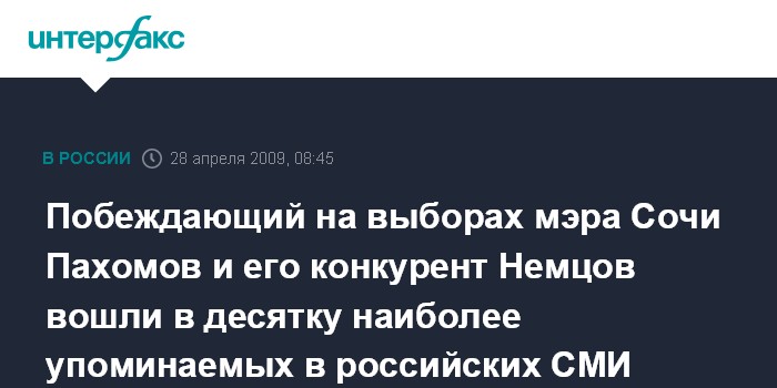 Побеждающий на выборах мэра Сочи Пахомов и его конкурент Немцов вошли в десятку наиболее упоминаемых в российских СМИ персон