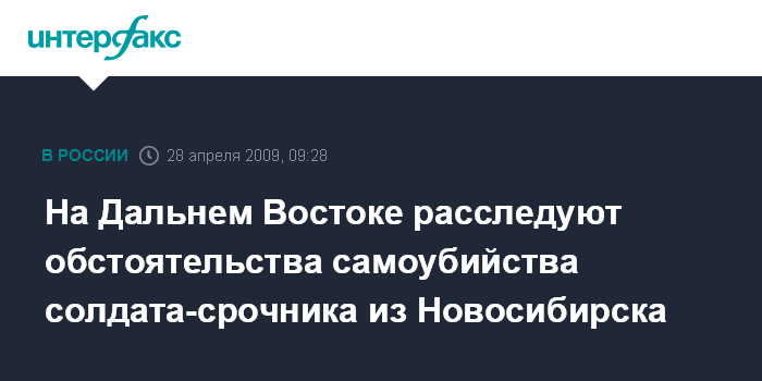 "Случившееся произошло 16 апреля. Утром молодой человек был обнаружен повешенным на солдатском ремне в комнате для сушки белья. На военную службу он был призван из Новосибирска. Подозреваемых по этому делу пока нет", - сообщил агентству "Интерфакс - Дальний Восток" во вторник следователь по особо важным делам Военно-следственного управления СКП РФ по ДВО Владимир Лымарь.
