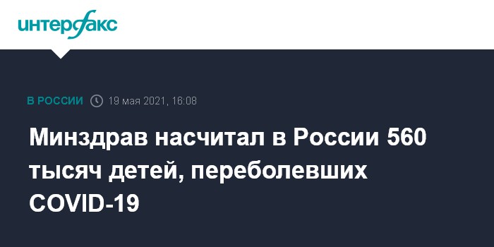 Москва. 19 мая. INTERFAX.RU - В России с начала пандемии коронавирусной инфекцией переболели около 560 тысяч детей в возрасте моложе 18 лет, 112 тысяч из них нуждаются в контроле за сатурацией, говорится в проекте приказа Минздрава, размещенном на портале проектов нормативных правовых актов.