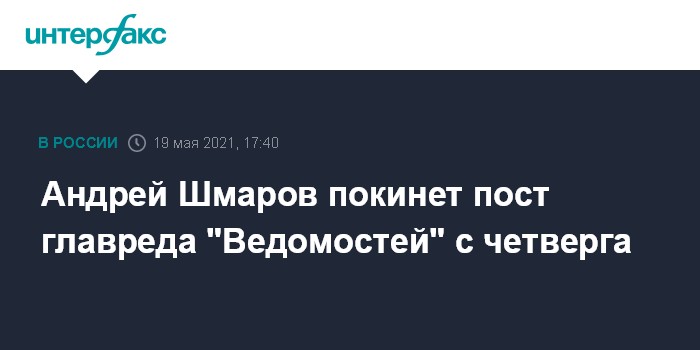 Москва. 19 мая. INTERFAX.RU - Главный редактор "Ведомостей" Андрей Шмаров покидает свой пост, с завтрашнего дня исполнять его обязанности будет Ирина Казьмина, ранее занимавшая пост заместителя гендиректора по редакционному развитию АО "Бизнес Ньюс Медиа".