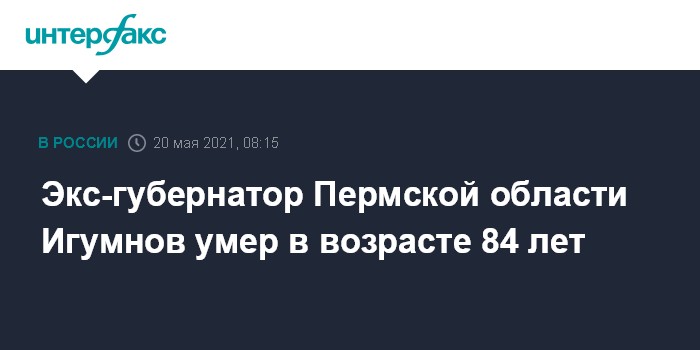 Москва. 20 мая. INTERFAX.RU - Бывший губернатор Пермской области Геннадий Игумнов, возглавлявший регион с 1996 по 2000 год, скончался на 85-м году жизни, сообщил в четверг в фейсбуке депутат Госдумы РФ Игорь Сапко.