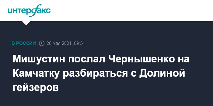 Москва. 20 мая. INTERFAX.RU - Премьер-министр Михаил Мишустин направил вице-премьера Дмитрия Чернышенко на Камчатку и поручил разобраться с возможностями развития туристического потенциала Долины гейзеров и Камчатского края, сообщает пресс-служба правительства.