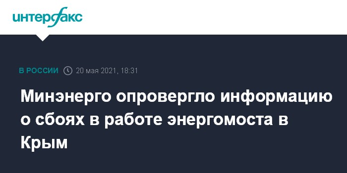 Москва. 20 мая. INTERFAX.RU - Энергомост в Крым работает в штатном режиме, один из резервных кабелей на профилактическом ремонте, сообщили журналистам в Минэнерго РФ после появления информации от крымского регулятора о возможном повреждении одной из ниток энергомоста.