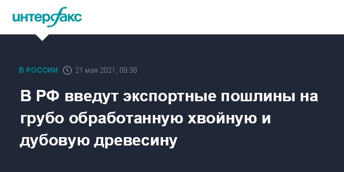 Москва. 21 мая. INTERFAX.RU - Правительство РФ впервые установило экспортные пошлины на некоторые виды грубо обработанной древесины. Как следует из сообщения пресс-службы кабмина, с 1 июля до конца текущего года в России вводятся пошлины на вывоз лесоматериалов с уровнем влажности, превышающим 22%.