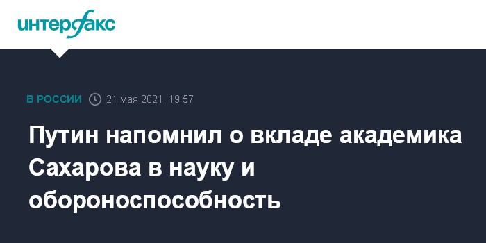 Москва. 21 мая. INTERFAX.RU - В обращении к участникам мероприятия в честь 100-летия со дня рождения академика Андрея Сахарова президент Владимир Путин напомнил о бесценном вкладе этого ученого в развитие научной мысли, в обеспечение обороноспособности и национальной безопасности страны. Обращение опубликовано на сайте Кремля.