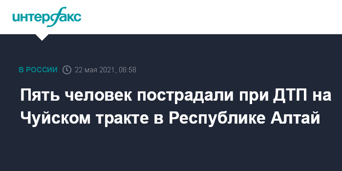 Москва. 22 мая. INTERFAX.RU - Пять человек пострадали в ночь на субботу в результате ДТП на Чуйском тракте в Республике Алтай, сообщает пресс-служба ГУ МВД РФ по региону.
