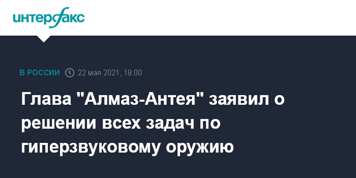 Москва. 22 мая. INTERFAX.RU - Российские специалисты смогли решить все сложности при создании гиперзвукового оружия, в том числе по материалам, сообщил гендиректор концерна ВКО "Алмаз-Антей" Ян Новиков.