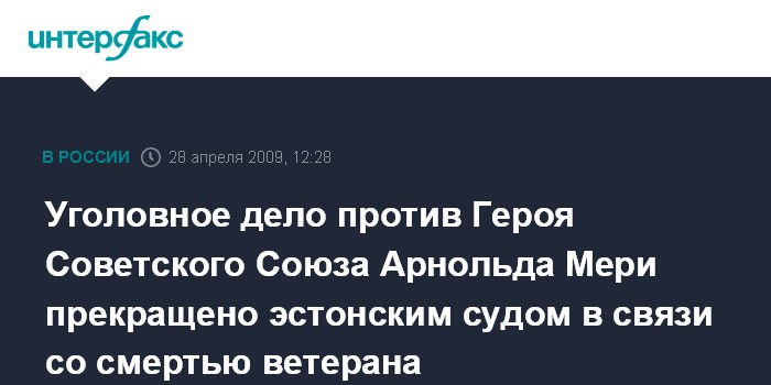 Москва. 28 апреля. INTERFAX.RU - Пярнуский уездный суд Эстонии прекратил уголовное дело в отношении Героя Советского Союза Арнольда Мери в связи со смертью подсудимого.