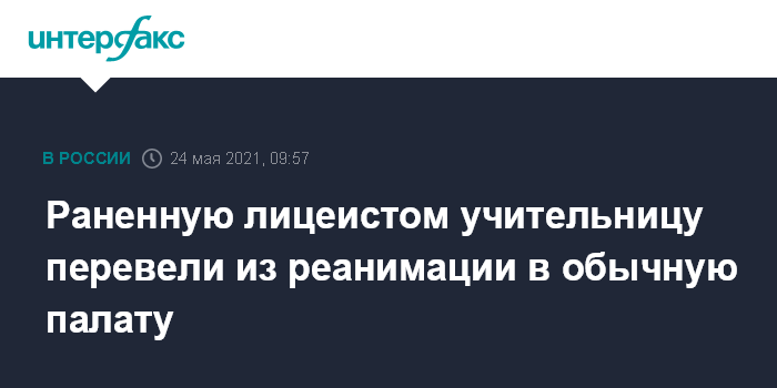 Москва. 24 мая. INTERFAX.RU - Учительницу физики лицея № 1 в Березниках, которую ранил ножом ученик, перевели из реанимации в общую палату краевой больницы в Перми, ее жизни уже ничто не угрожает, сообщили "Интерфаксу" в пресс-службе регионального Минздрава.