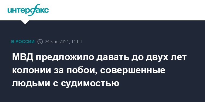 Москва. 24 мая. INTERFAX.RU - Законопроект, предполагающий наказание до двух лет лишения свободы за нанесение побоев лицом, имеющим судимость, подготовлен в МВД РФ.