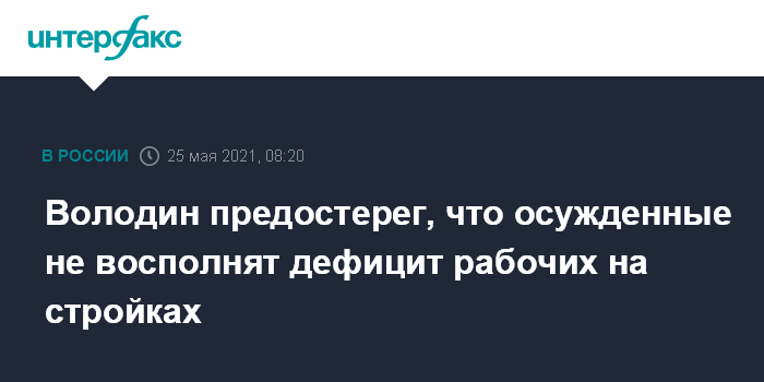 Москва. 25 мая. INTERFAX.RU - Спикер Госдумы Вячеслав Володин сказал журналистам, что в целом поддерживает идею использовать труд осужденных на крупных стройках, которым сейчас не хватает рабочих рук. Однако он предупредил, что осужденных не хватит для полной замены трудовых мигрантов.