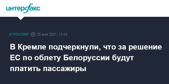 Москва. 25 мая. INTERFAX.RU - Москва сожалеет в связи с поспешными рекомендациями Евросоюза для авиакомпаний обходить воздушное пространство Белоруссии, заявил пресс-секретарь главы российского государства Дмитрий Песков.