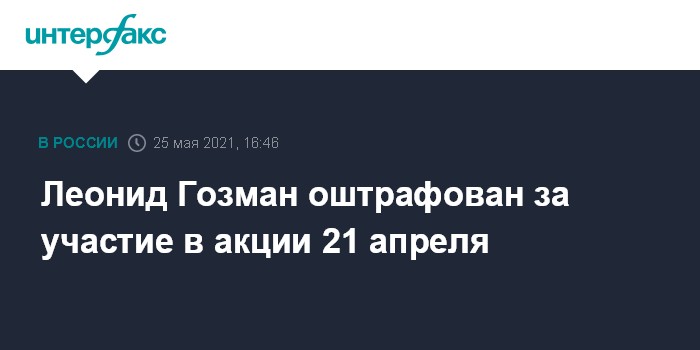 Москва. 25 мая. INTERFAX.RU - В Москве Гагаринский суд оштрафовал политика Леонида Гозмана на 20 тысяч рублей за участие в несогласованной акции в поддержку Алексея Навального 21 апреля.