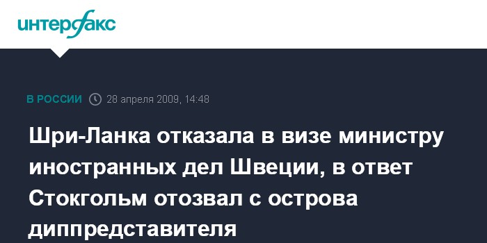 Москва. 28 апреля. INTERFAX.RU - МИД Шри-Ланки отказал в выдаче визы главе МИД Швеции Карлу Бильдту, который в среду намеревался нанести визит на остров вместе с главой МИД Франции Бернаром Кушнером и главой Форин Офис Великобритании Дэвидом Милибэндом в рамках европейской дипломатической миссии, сообщает британская телерадиокорпорация Би-би-си.