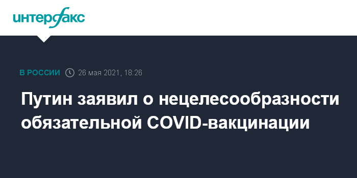 Москва. 26 мая. INTERFAX.RU - Президент РФ Владимир Путин высказался против принудительной вакцинации от коронавируса, считает, что она должна быть сугубо добровольной.