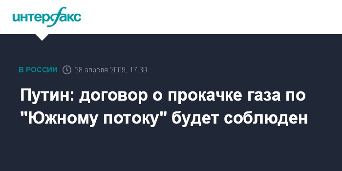 Москва. 28 апреля. INTERFAX.RU - Премьер-министр РФ Владимир Путин подтвердил, что Россия твердо намерена исполнять свои обязательства, связанные с прокачкой газа по трубопроводу "Южный поток".