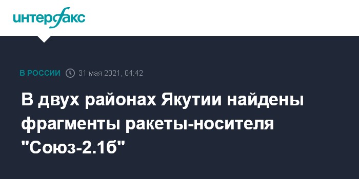 Москва. 31 мая. INTERFAX.RU - Спасатели обнаружили отделяющиеся части ракеты-носителя "Союз-2.1б" в Алданском и Кобяйском районах Якутии и готовятся к их эвакуации, сообщает в понедельник пресс-служба Службы спасения республики.