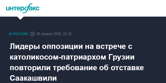 Тбилиси. 28 апреля. ИНТЕРФАКС - Один из лидеров грузинской оппозиции Губаз Саникидзе заявил, что на встрече с католикосом-патриархом Грузии Илией Вторым во вторник вечером оппозиционеры обозначили свою позицию, согласно которой диалог с президентом Михаилом Саакашвили может быть лишь по вопросу о его отставке.