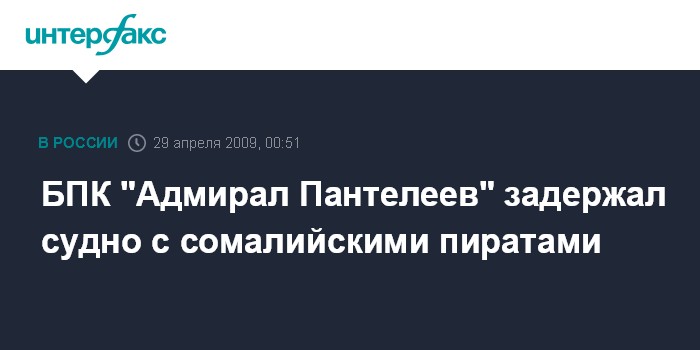 "Примерно в 15 милях восточнее побережья Сомали в зоне интенсивного судоходства в 18:12 мск большим противолодочным кораблем "Адмирал Пантелеев" задержано и досмотрено судно с пиратами на борту", - сказал собеседник агентства.